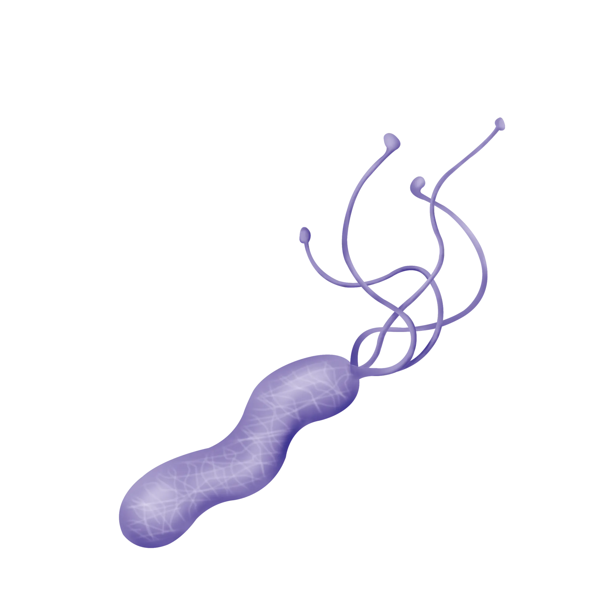 ヘリコバクター・ピロリ(Helicobacter pylori:通称ピロリ菌)は、胃の下部(幽門部や前庭部)の粘膜に定着するグラム陰性の細菌です。菌体はらせん状で、大きさは約 0.5 × 2.5–4.0 μmです。数本のべん毛をもち、胃粘液の中を泳ぐことができます[1][図1]。