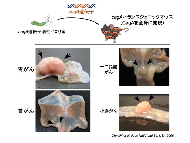 - CagAをマウスの全身の細胞で発現するトランスジェニックマウスでは、胃粘膜の細胞増殖が異常に亢進して胃がんが自然に発症し、また、小腸や血液細胞でも同様に発がんが起こることが報告されています。一方で、正常のマウスではがんが自然発症することはありません。この結果から、CagAは哺乳動物に発がんを起こす能力をもつ、細菌由来の発がん促進タンパク質(bacterial oncoprotein)であることが実証されました[7,9]。