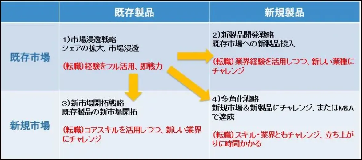 転職市場でアンゾフマトリクスを応用した場合、既存市場で既存製品の枠は、同じ業界・同じ職種に転職するケースとなり、経験をフル活用できますが、新規性が低い点は長い目でみるとデメリットになるかと思います。右に移り、既存市場で新規製品の枠は、同じ業界・違う職種に転職するケースになりますので、過去の業界経験・人脈を活用しつつ、初めての職種にチャレンジでき、自身の仕事の幅は広がるメリットがあります。このように、フレームワークを様々なケースに応用することで、全体を網羅しつつ、どのオプションを選ぶことが最適かを冷静に判断することができます。