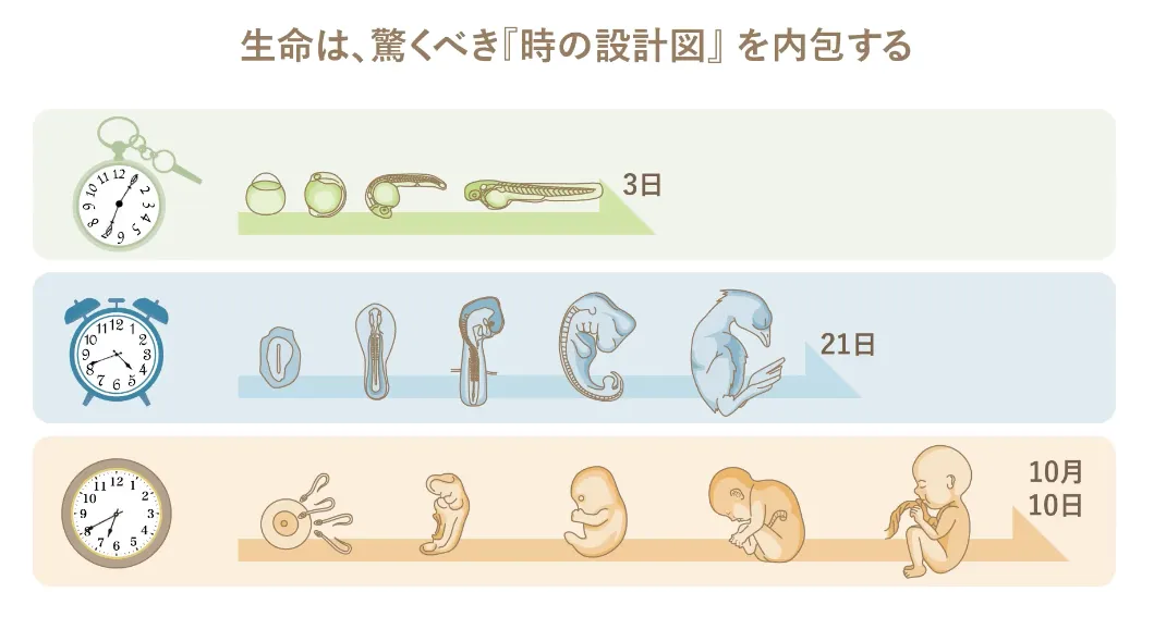 荻沼:たとえばヒトの場合なら、よく十月十日といわれるように、妊娠してから生まれてくるまでの期間がほぼ決まっています。さらにこの間に、母胎内で体が形づくられていく順番も決まっています。具体的には胎児の神経管や頭部が先にできて、手足がつくられていくのはその後といった具合です。生まれてくるまでの時間に違いはあっても、受精からの一連のプロセスは、どの動物もほぼ同じです。なぜなら動物ではその種ごとに、受精してからの成長過程が定められているからで、これが生命の「時の設計図」です。