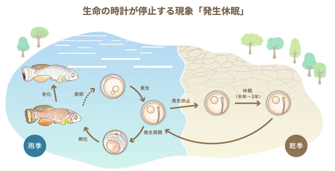 荻沼:ターコイズキリフィッシュは乾季の間は休眠状態です。外部環境の条件を人工的に整えれば、この休眠状態を3年ぐらい維持できるのがわかっています。しかも長期間休眠していても、ひとたび目覚めれば普通に成長していきます。この間には代謝が止まっているわけではなく、胚の周囲にある卵黄から栄養を得て代謝しています。つまり栄養を与え続ければ、休眠状態をずっと維持できる可能性もある。一連のメカニズムの中ではpHも変化していると考えられますが、その点まではまだ解明できていません。