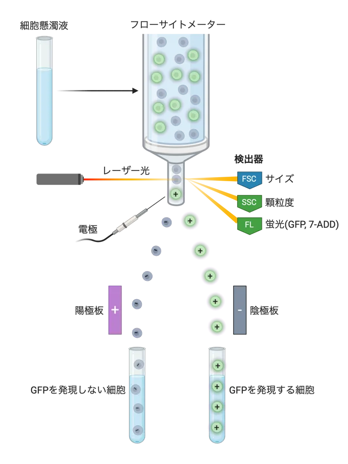 では、フローサイトメトリーでGFP発現細胞をソーティングする実験手順の概略をご紹介しましょう。