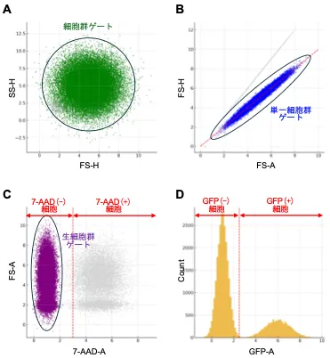 *GFPを発現しない単一細胞試料を同一設定のフローサイトメーターで事前に展開し、GFP蛍光陰性細胞を定義する閾値を設定しておく([図2D] 赤破線)。