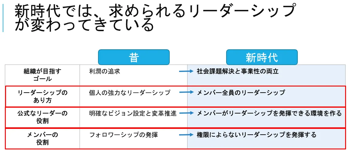 VUCA時代となり、組織に求められることは利潤の追求だけでなく、社会課題解決と事業性の両立に変わってきました。今現在の社会課題解決を達成するためには昔ながらの「強いリーダー」「答えを知っているリーダー」が正しい答えを導くとは限りません。誰が答えを導きだせるか分からないのが新時代です。つまり、新時代では図の赤枠で示すように「個よりも、集団としてのリーダーシップ発揮」が求められるようになっています。