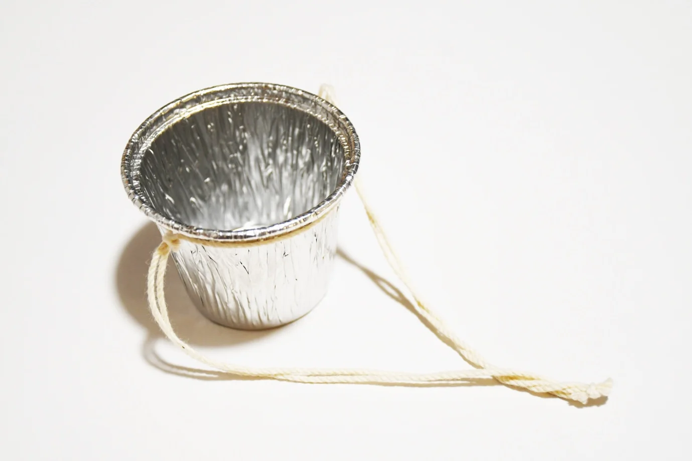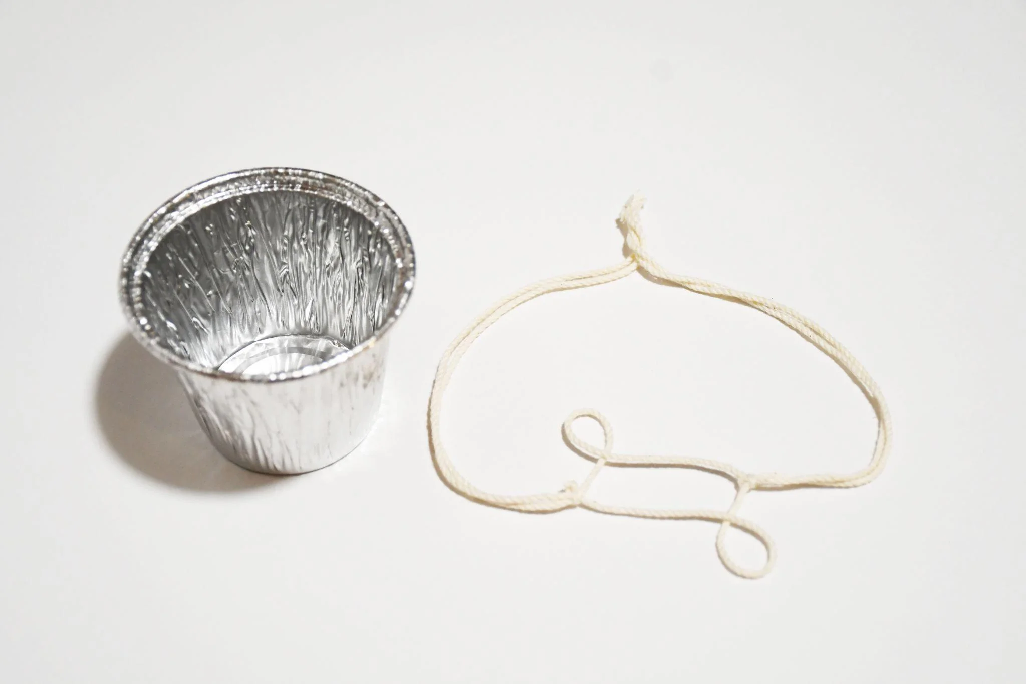測定装置は、ランプのような燃料の燃焼部分と、その熱を水に受ける感熱部分から構成されます。熱を水に伝える部分としてはアルミカップのような薄く熱伝導率の高い容器を吊るして用います。吊るすためにタコ糸を輪の形に縛り、ここにカップを差し込んで使います。下には万一に備えて金属トレーなどを敷いておくと安心でしょう。