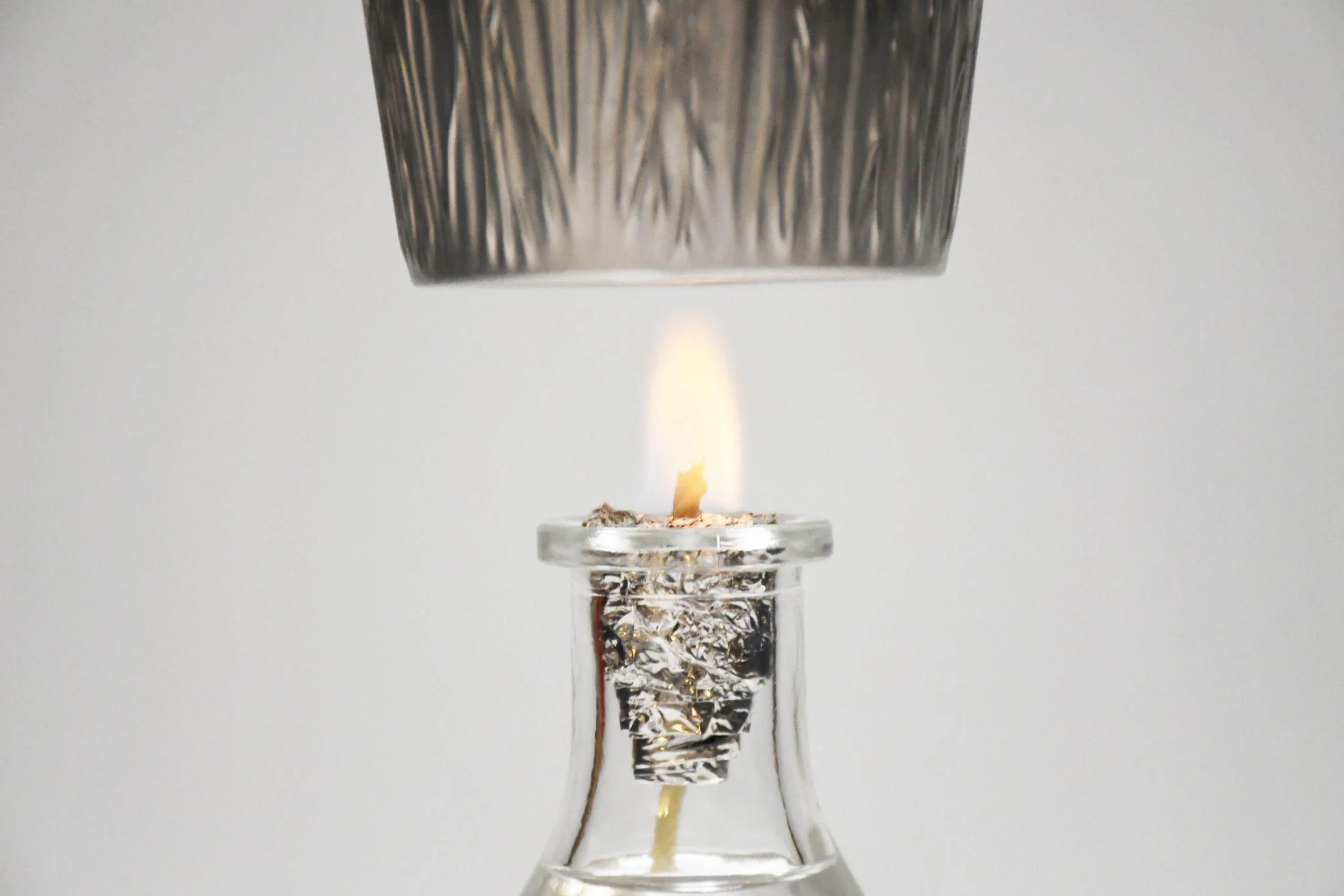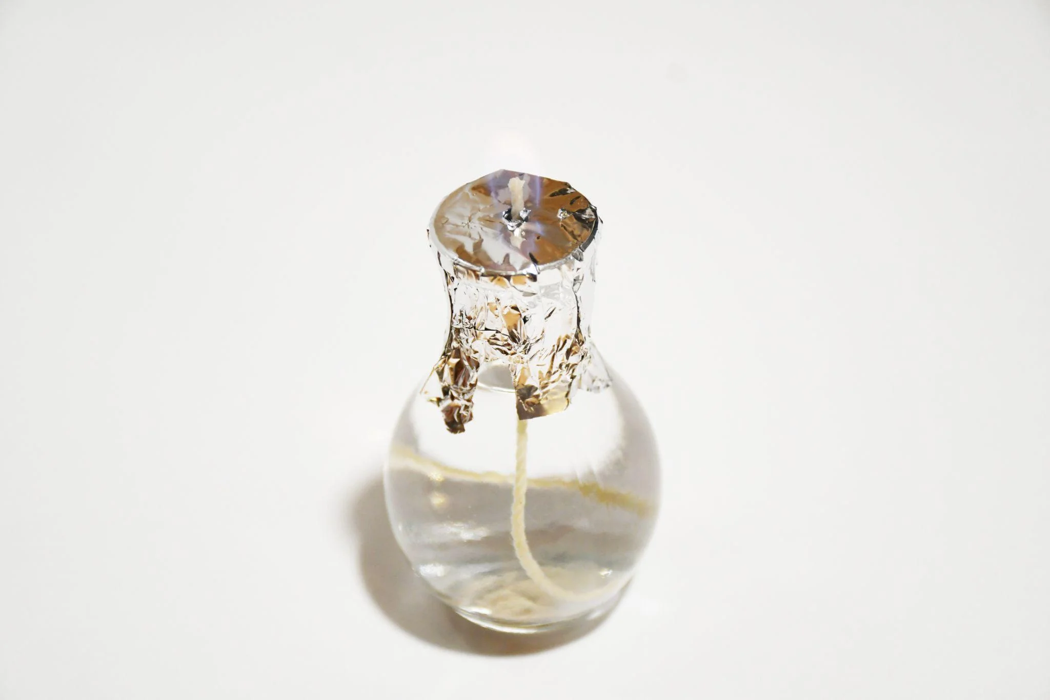 燃焼部分としては、小さなガラス瓶に燃料を入れてタコ糸を芯として用います。アルミ箔などで芯を固定すれば簡易的なランプになります。なお、灯油の測定にあたってアルコールランプに灯油を入れて用いると、火力が強くなりすぎてしまいます。そのため、今回のような自作の小型灯油ランプを使用します。市販の小型石油ランプがあれば、それを用いてもよいでしょう。