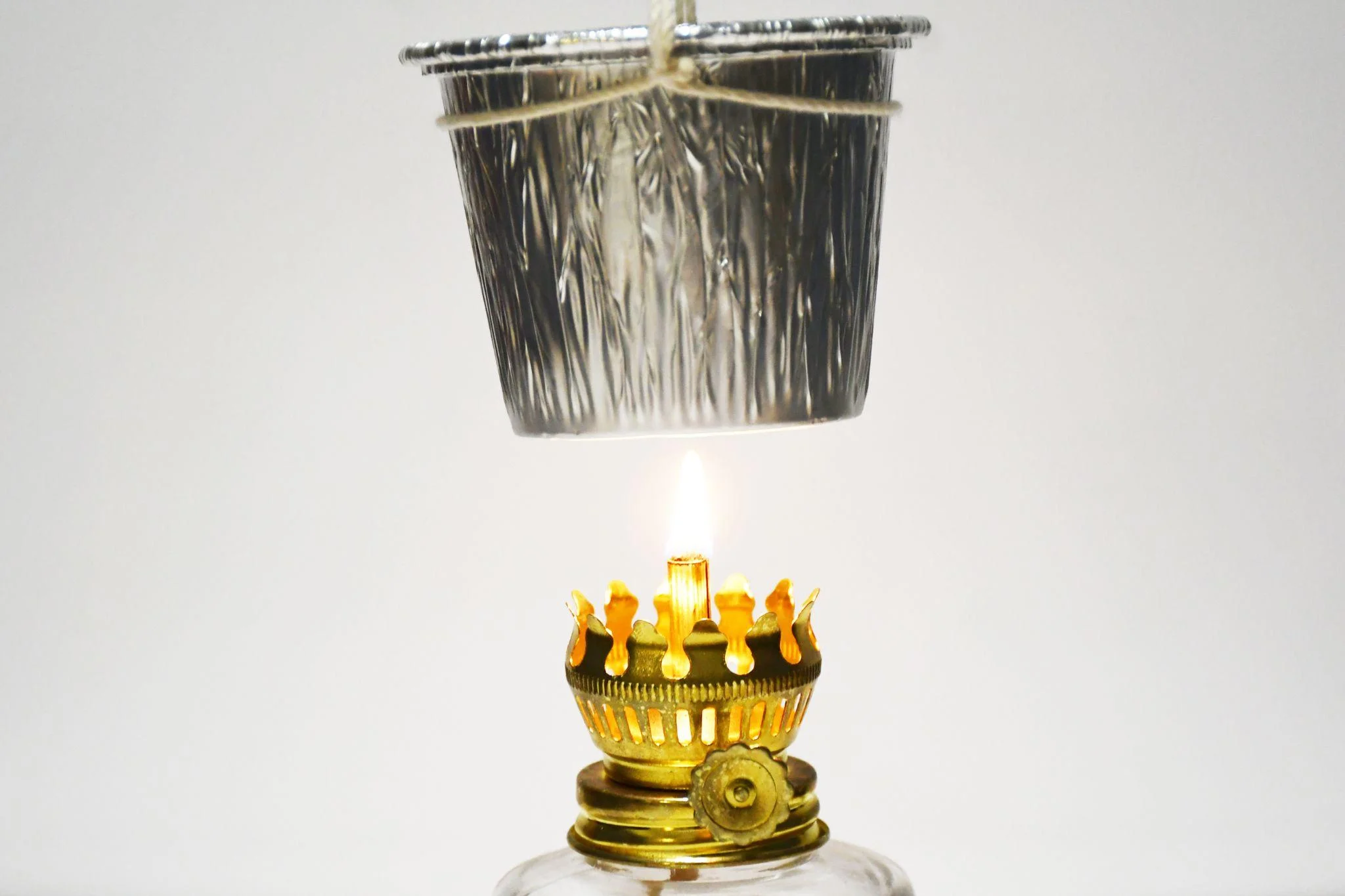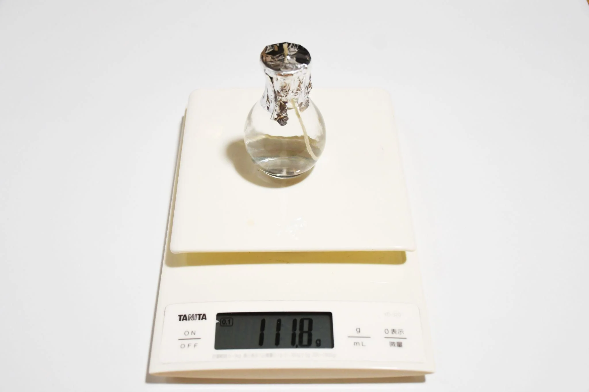 それでは、食用油のカロリー測定を行います…と言いたいところではあるのですが、市販されている油は粘度が高く、煤も出やすいので今回のような簡易的なランプでは安定して燃焼させることが難しいことがわかりました。そこで、代用として灯油のカロリーを測定してみましょう。灯油であればサラサラとしていて、火力調節もしやすく扱いやすいでしょう。