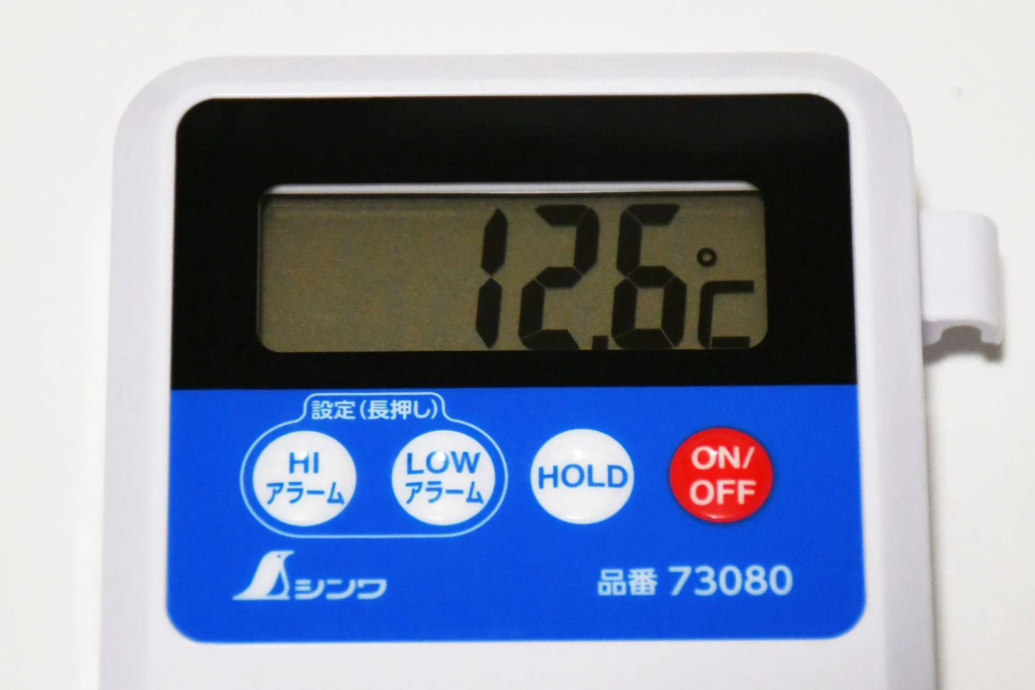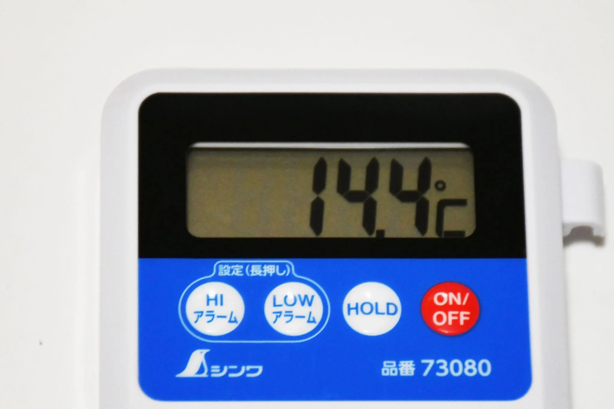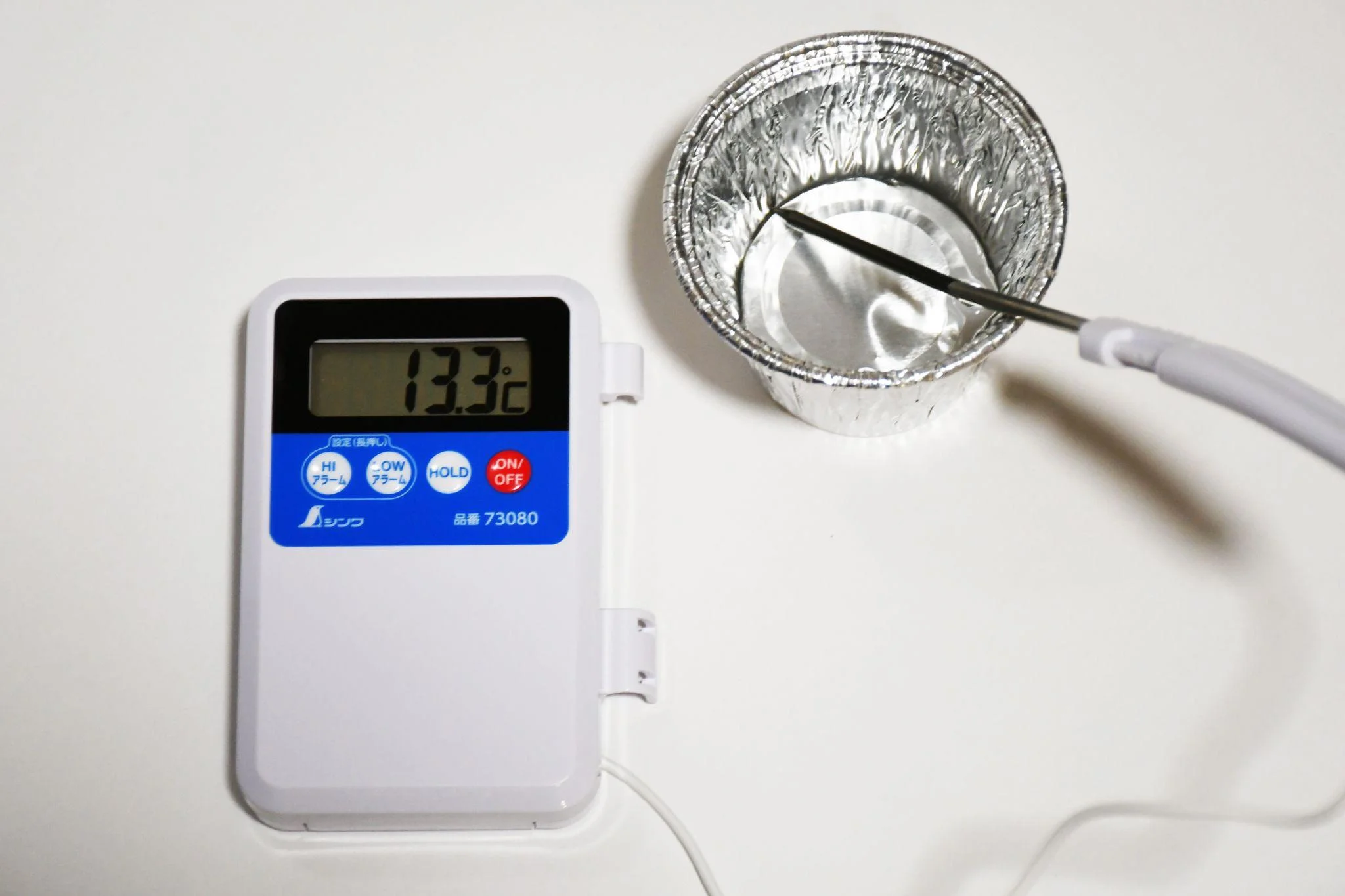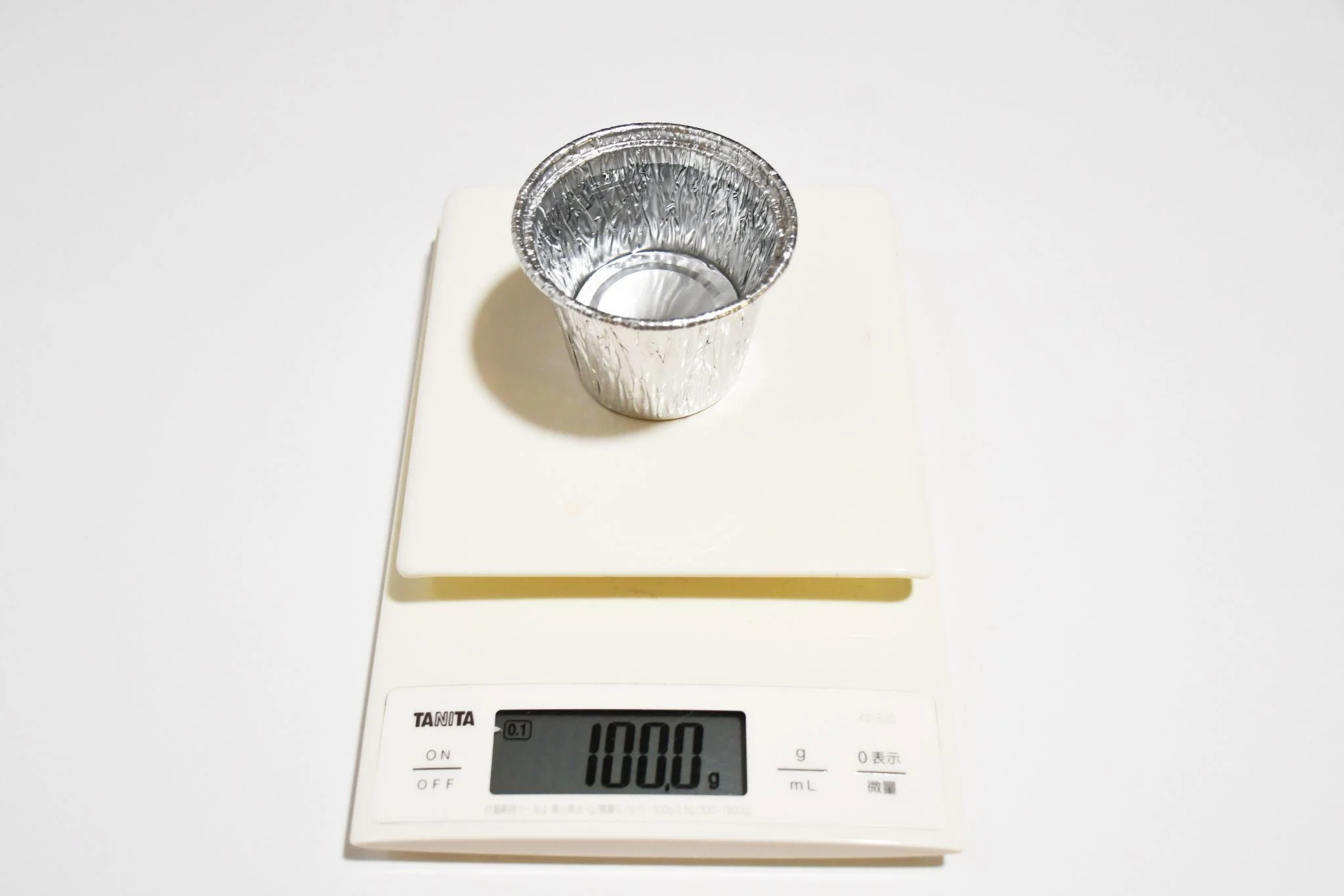 次に、アルミカップに水(可能であれば純水が望ましい)を100g入れて温度を測定しておきます。
