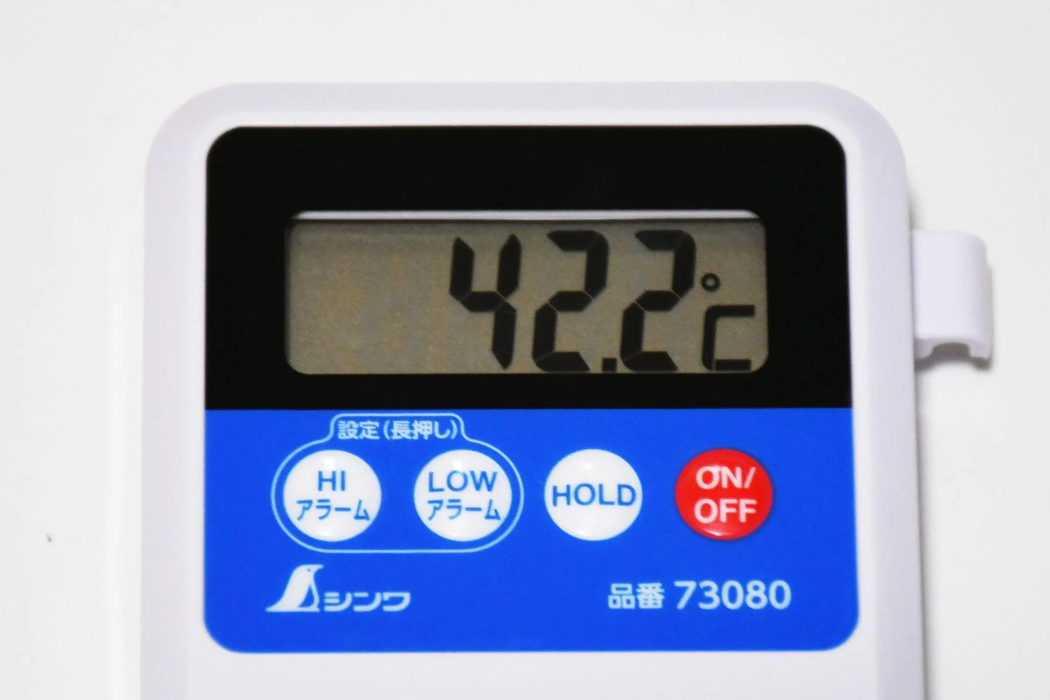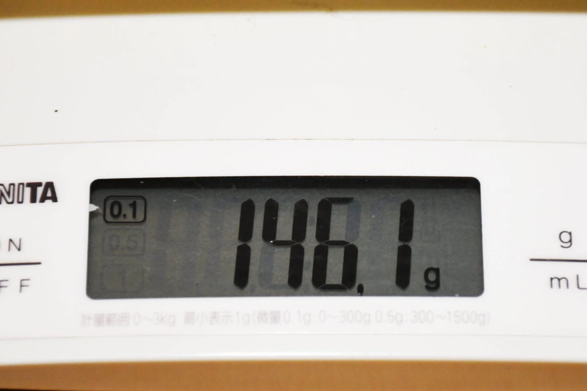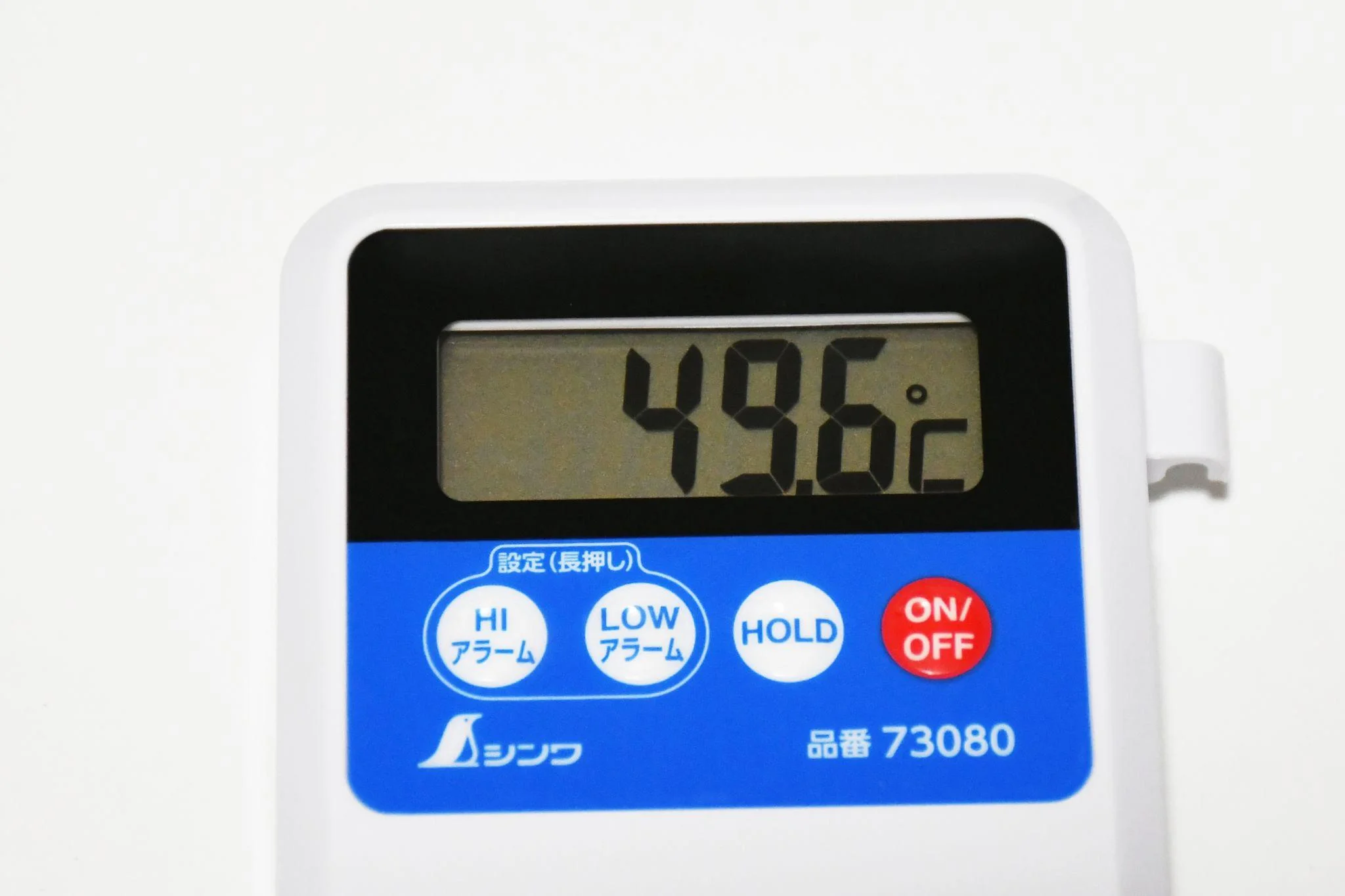 測定の結果、水温は14.4℃から42.2℃へ27.8℃上昇、ランプの総重量は146.1gから145.6gへ0.5g減少しました。